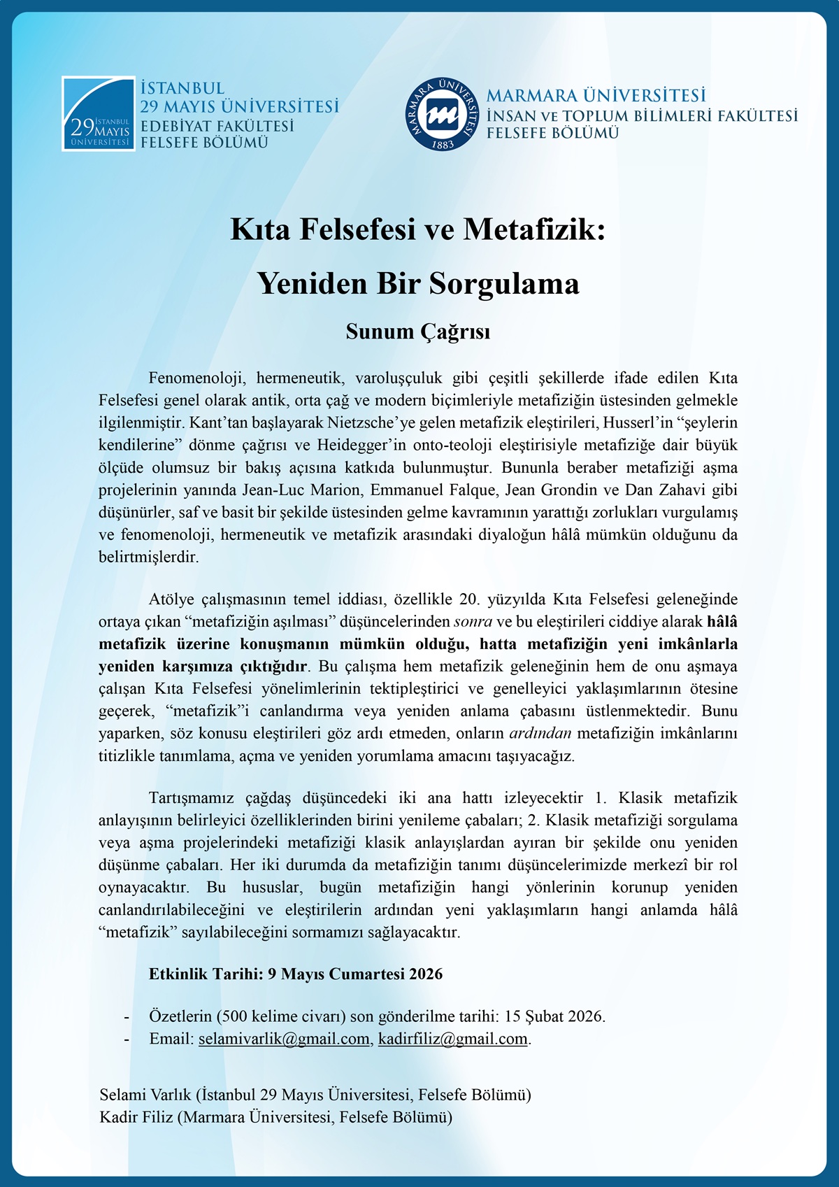 Kıta Felsefesi ve Metafizik: Yeniden Bir Sorgulama Etkinliği Sunum Çağrısı